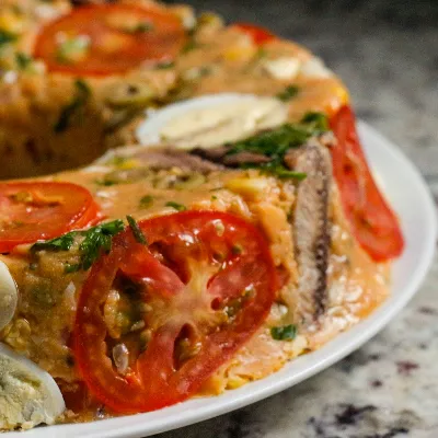 Unte uma forma com azeite e disponha sardinha, tomate, ovo, palmito, azeitona e salsinha no fundo. Reserve.